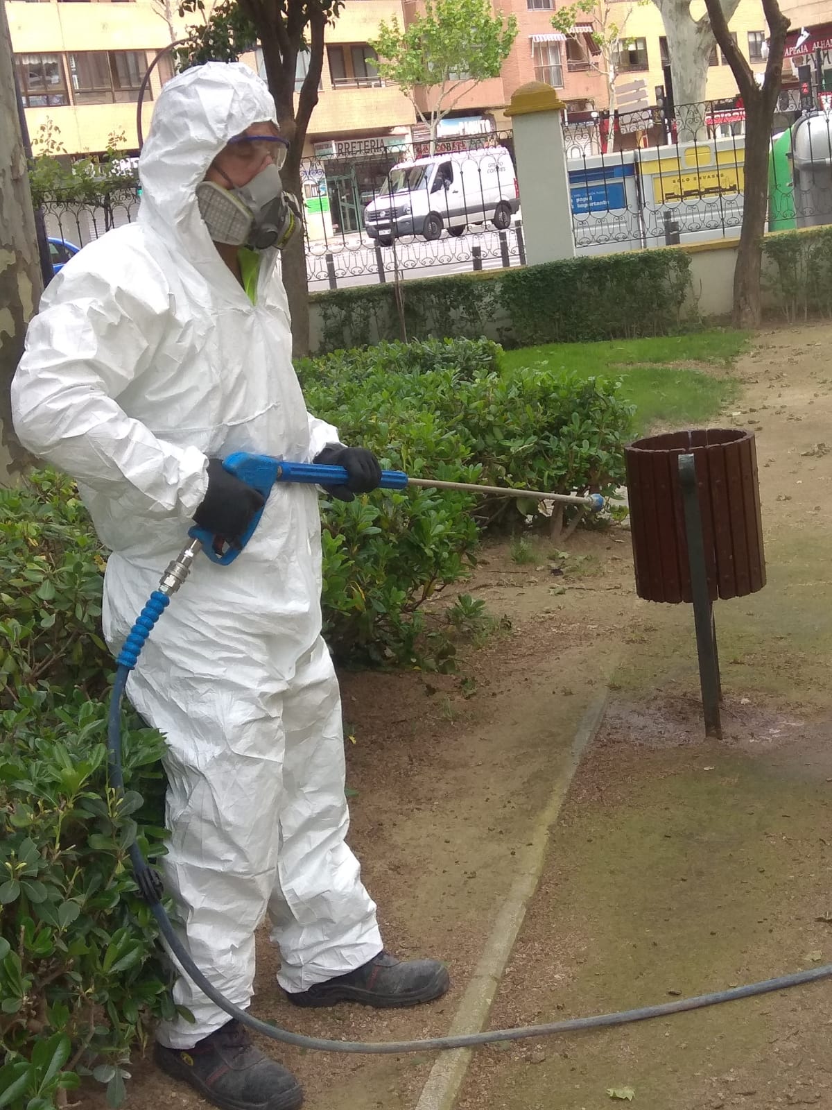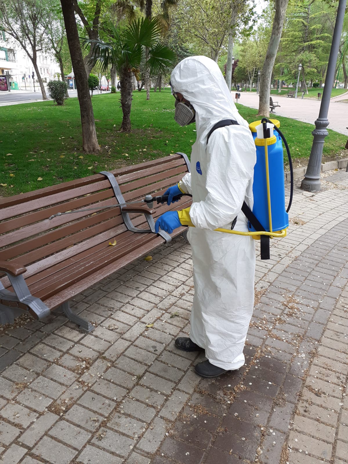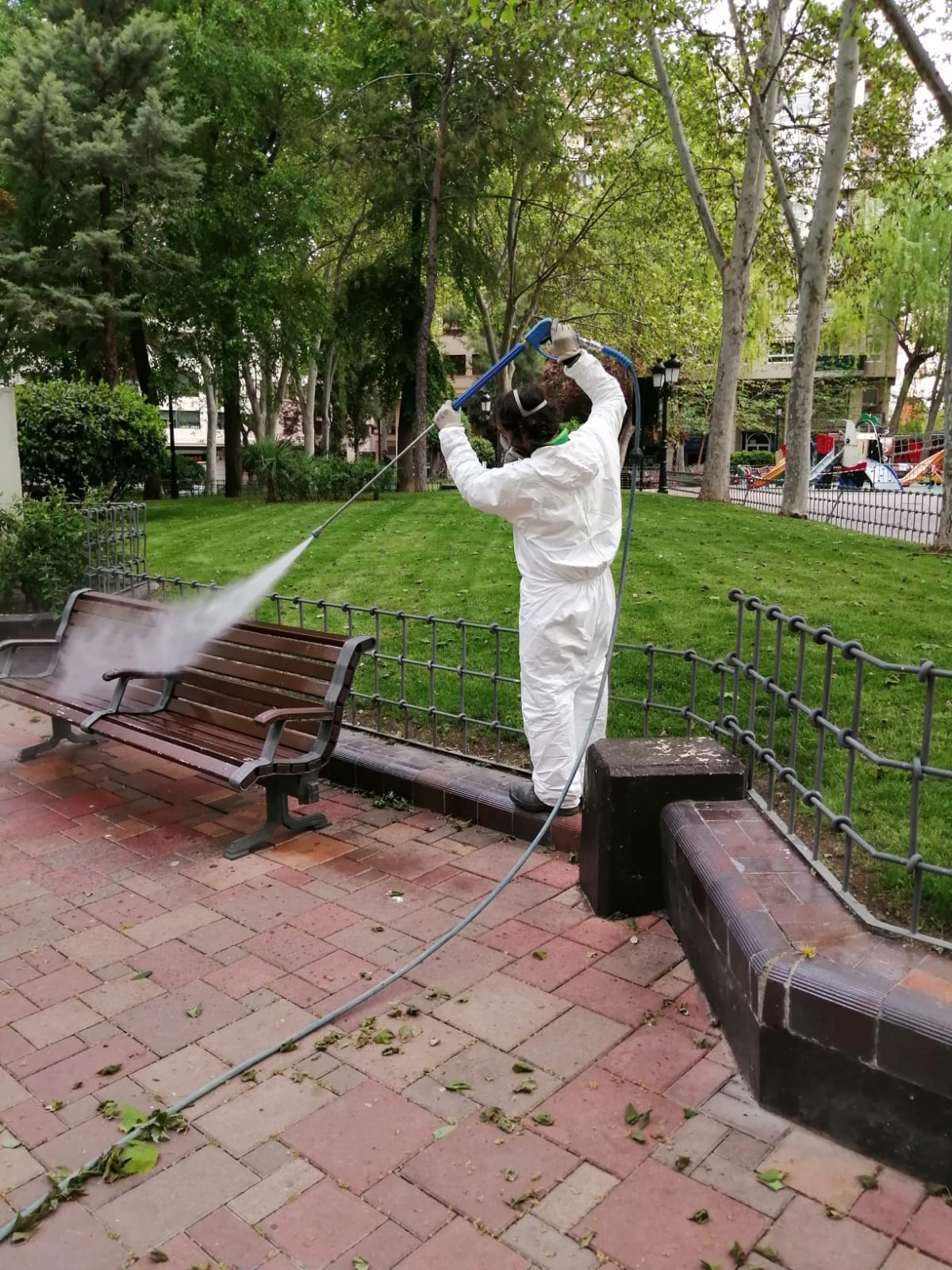 Con la intención de mantener el mejor estado de desinfección en parques y jardines se emplea desinfectante y se aplica con mochilas o con hidrolimpiadora. Esta tarea se realiza a diario en las primeras horas de la mañana para evitar molestias a los usuarios.